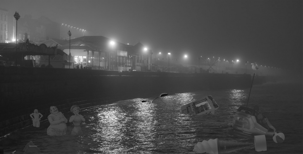 I designed my collage to have a dark, drab and brooding tone. It features various icons and staples of Bridlington and the British seaside floating in the waters of Bridlington’s beach close to the promenade, during a fog-encased night, all in grey-scale. The reason for this is to portray the growing disregard and reducing appreciation for Bridlington’s existence, culture and beauty over time. During the present day many have forgotten about it, or simply do not wish to visit any longer. The attractions and sights we used to enjoy and the memories we experienced sit idle in the natural ocean as contaminating garbage, no longer attractive or of worth, ready to be washed away, but still linger due to the tide and the waves keeping it in place.