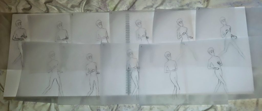 After sketching what the key positions would look like, I used tracing paper to hand-illustrate each frame. Using tracing paper allowed me to see each previous frame so I knew where to draw the placement of each limb, recreating the onion-skin effect found on animation software. I decided to hand draw the frames as when it comes to digital art I find it easier to sketch out the design on paper first, and then trace and refine the design digitally.