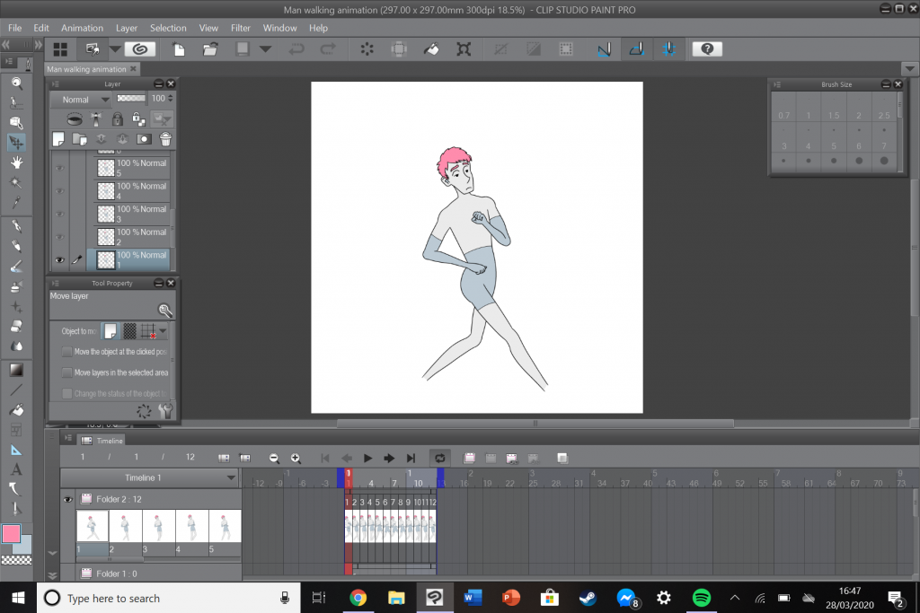 Finally, using the same software I assigned each digitally drawn frame to a point in the animation timeline, moved each illustration to a different height to replicate the bounce of walking, and exported it as an .mp4 file.
