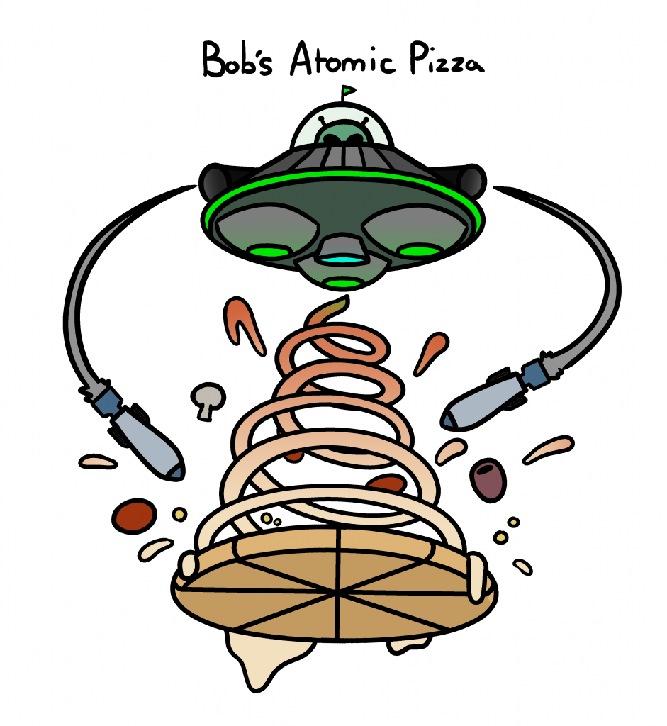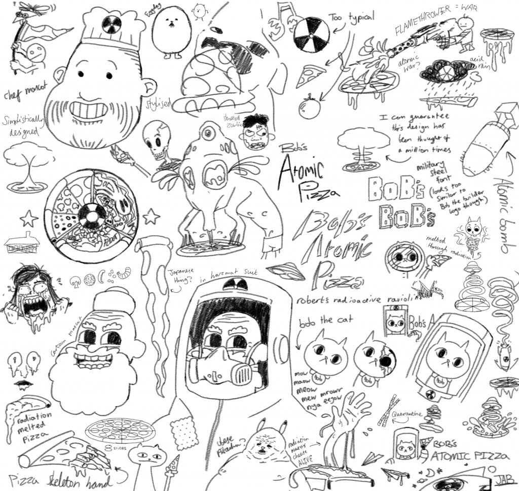 For my ‘Bob’s Atomic Pizza’ logo concept I wanted to avoid creating a generic logo that would include imagery like a basic atomic sign or a mushroom cloud etc., as these ideas aren’t very original and are atypical of the theme. It has been challenging to think of a more unique concept, but my favourite ideas that I believe are more unique are;