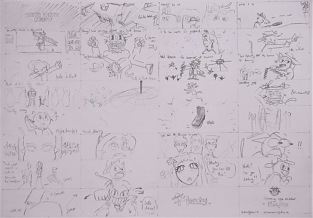 - Close up of Monty’s bad drawing on lined paper (Narrator: “And become the emperor of moves”)
