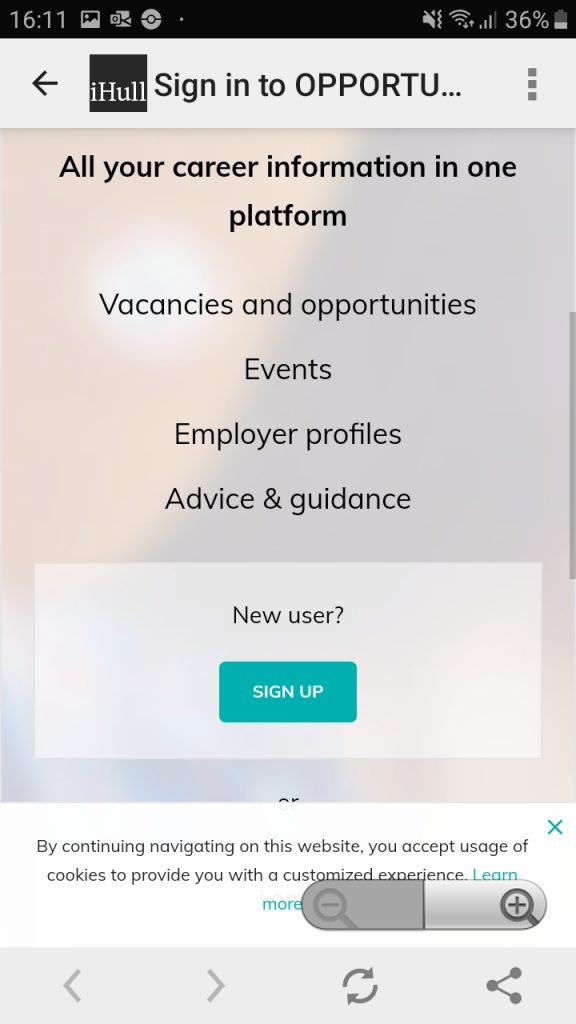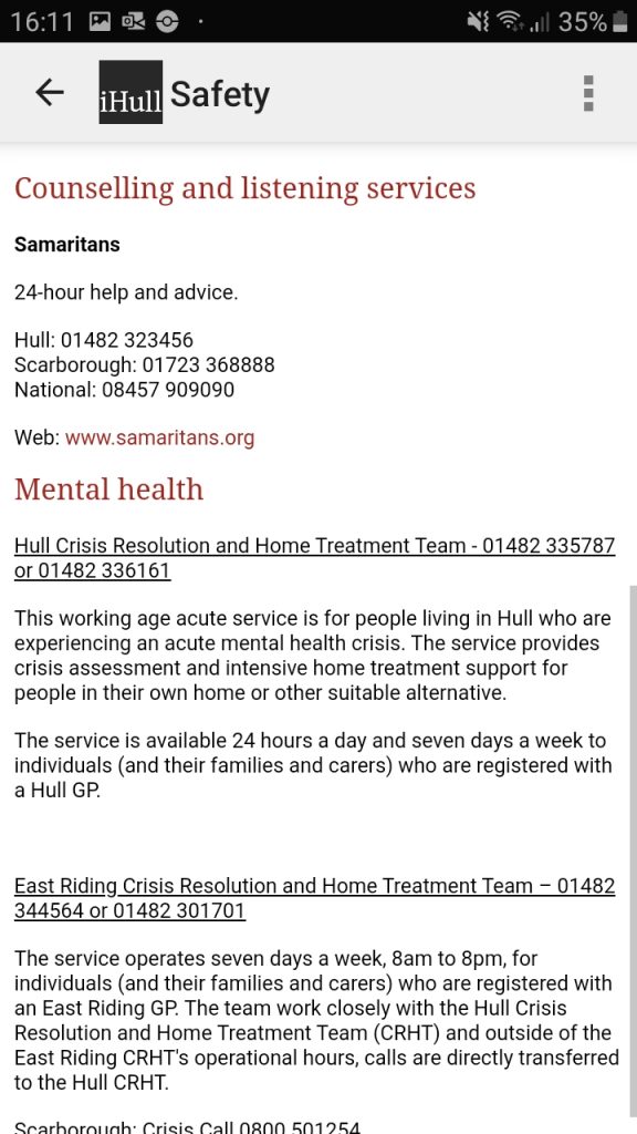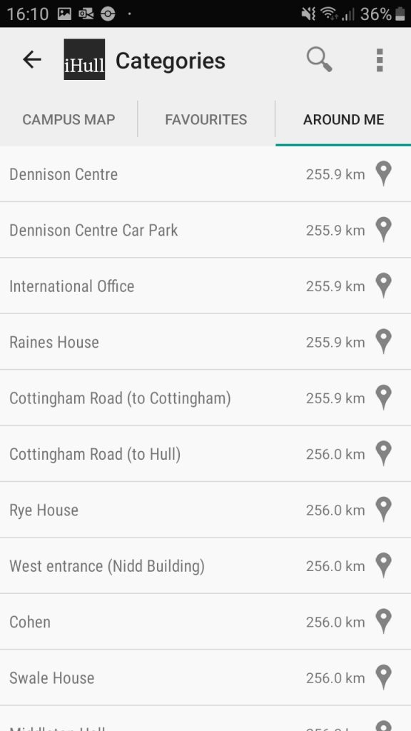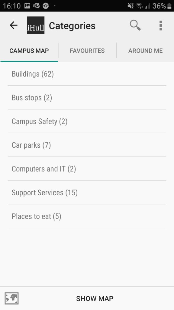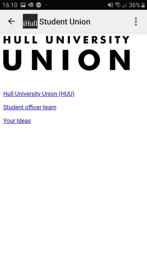 The Hull University Union page is one of the worst designed pages on the entire app, with it being just an image of a logo and three hyperlinks that take the user to an external browser. Having this instead of the information built-into the app is lazy in design and pointless as the information can be accessed through the user’s own internet browser instead. Since this shouldn’t even be classed as a functioning app page I rate it a 1/5.