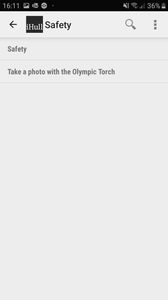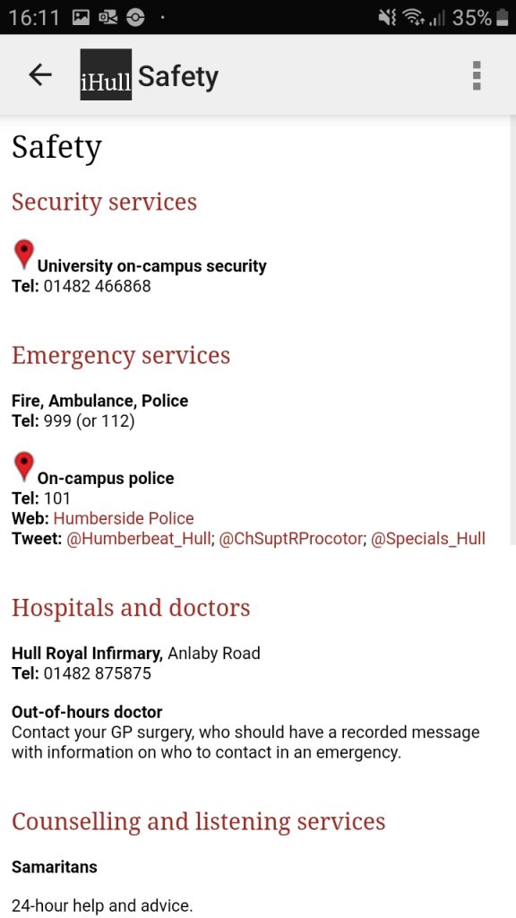The Safety page is unprecedently rather confusing, as upon opening it the user is faced with an additional ‘Safety’ button, as well as a button that states ‘Take a photo with the Olympic Torch’. This secondary Olympic Torch page only includes an image of an Olympic Torch with text stating students can come ‘today’ to take a photograph with an Olympic Torch on campus. This page does not make any sense to be included on the safety page, instead, it should be featured on an announcements page, if the app included one. Additionally, it makes no sense how the text tells the user that this event is happening ‘today’ – what time and date are being referred to exactly? The actual secondary safety page is very informative and useful to users who need immediate help, though. I rate this page a 3/5.