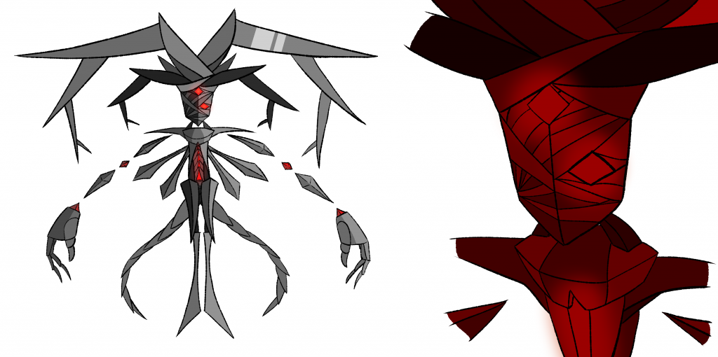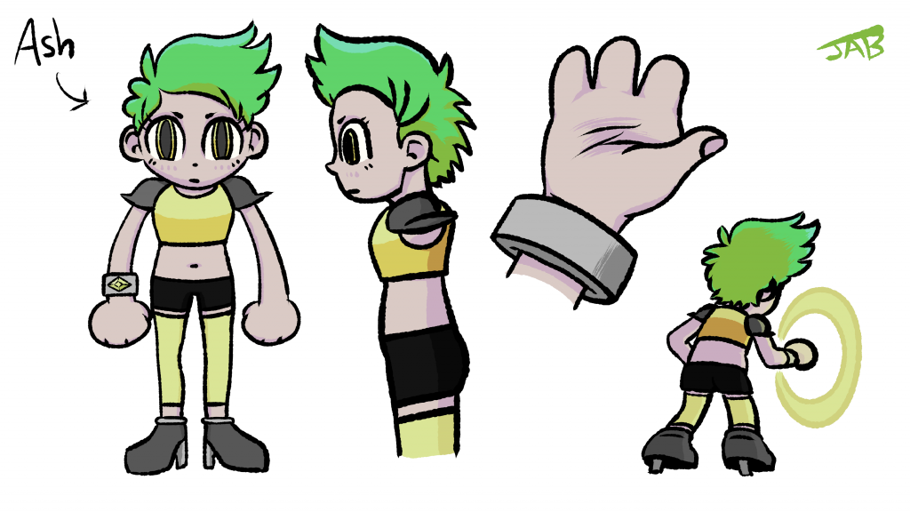 Ash is the game’s protagonist and primarily features yellows and greens throughout their design – colours that are used to express happiness, nature and warmth, reflecting that they are ‘good’ and trustworthy like a protagonist ‘should be’. Shades of grey are used for certain aspects of Ash’s armour to show that the material used is tough and durable enough for a hero to use when saving the day, complementing the sturdy shapes present in the armour’s design. However, one will notice how I’ve used cold and somewhat dull tones as opposed to warmth, which is most commonly used in protagonist design. This is a deliberate design decision of mine as cold hues reflect the artificiality and bleakness in the character’s world, their own mind and thoughts, their physical construction and their entire existence in the game’s plot. Ash is not a human character and the world they reside in is nothing like our own, so the way they think will not be intensive, emotional or passionate like a human. This in itself has a deeper meaning, representing how a playable character in a video game could never think or feel like a human or in-world NPC (non-playable character) would, as free will, decision making, interaction and external communication are restricted to what the player chooses. Ash has the physical appearance of a human, but inside they are cold and mute, thus reflecting the colour scheme.