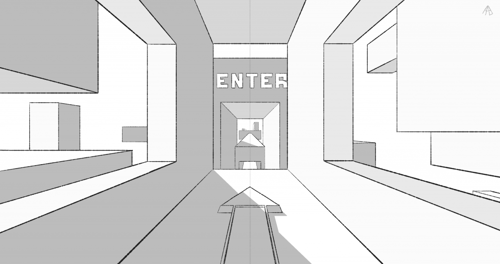 Figure 1: Concept art for a game level. Pictured is the beginning of the level, where the player character is dropped into the starting area, where the arrow on the ground tells the player which direction they should progress. A large ‘ENTER’ sign signals the entrance to the level itself, which extends through a tunnel further away.