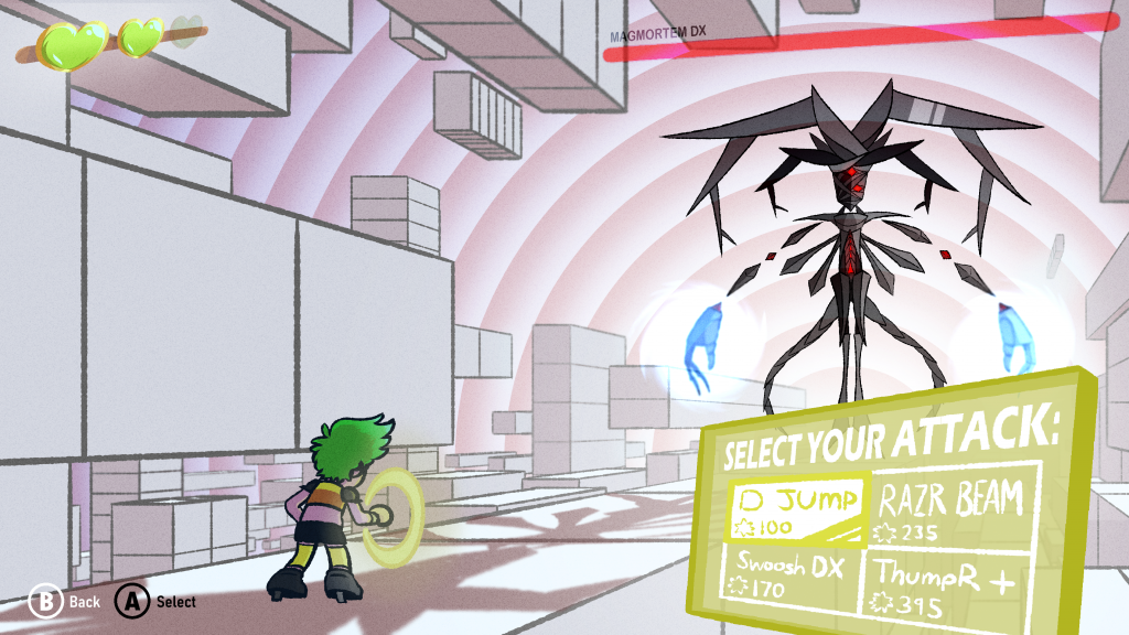 Starting with theory #1, the use of colour, I acknowledged my previously stated philosophy regarding colour schemes and baked it throughout the piece. Now both characters’ colour schemes have been applied to other new details featured in this piece, like an attack/command selection panel used to command the game to initiate attacks against the enemy coloured with Ash’s signature lime green, and the villain’s health bar floating above his head coloured bright red, both to keep with their respective theming consistency. I’ve used greys for the platforms to reflect neutrality and coldness, however, behind Magmortem DX red-ish bars of light pulsate against the neutral grey-blue background to show he has an influence on the environment around him.