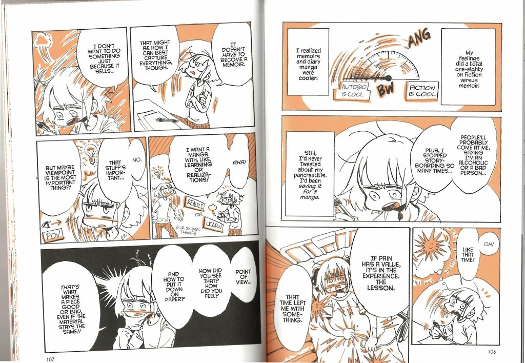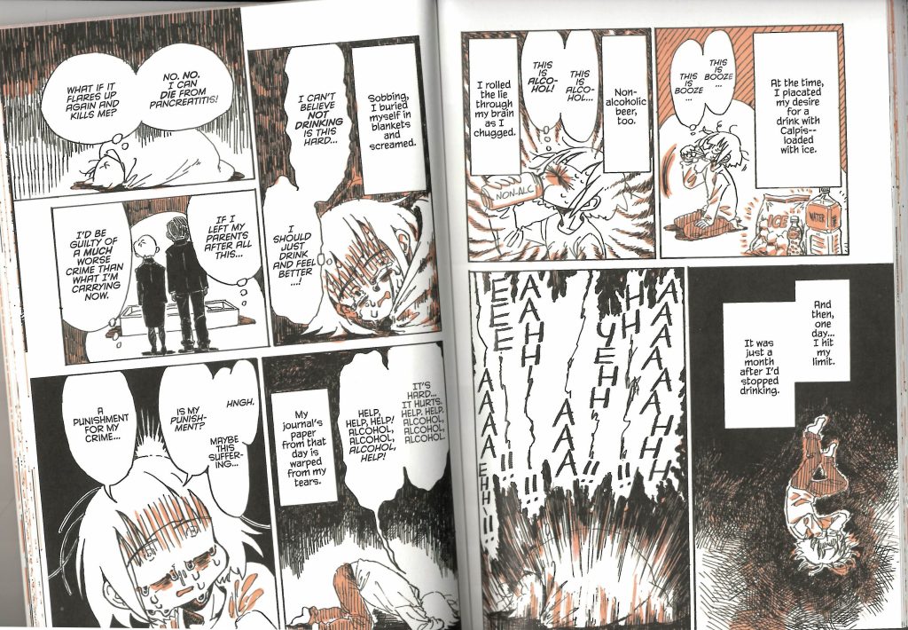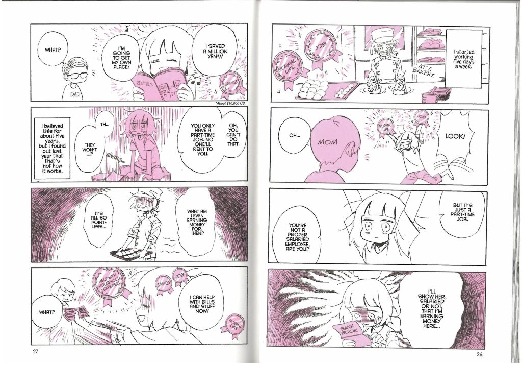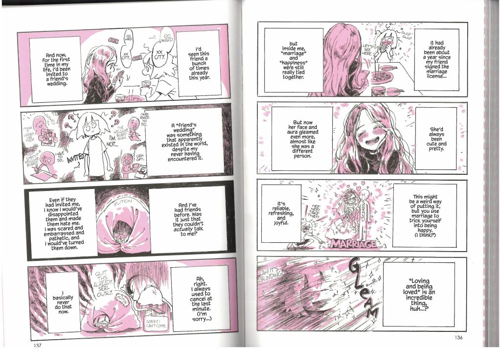The beauty of an autobiography being fully illustrated is that one can portray events, imagery, and most importantly emotion, with such instantaneous clarity. It allows the author to indeed exhibit what they are referring to without depending on long wordy narration to describe their emotions and points of view. With this medium, I can illustrate myself with the exact facial expression, and the exact body language, in the precise environment I am residing in and the exact situation I am facing, all within one singular panel. And, if need be depending on the narrative, the next panel can feature something entirely different from the one before it, being equally as instantaneously observable. Nagata-san’s work brilliantly demonstrates this in her series of publications.