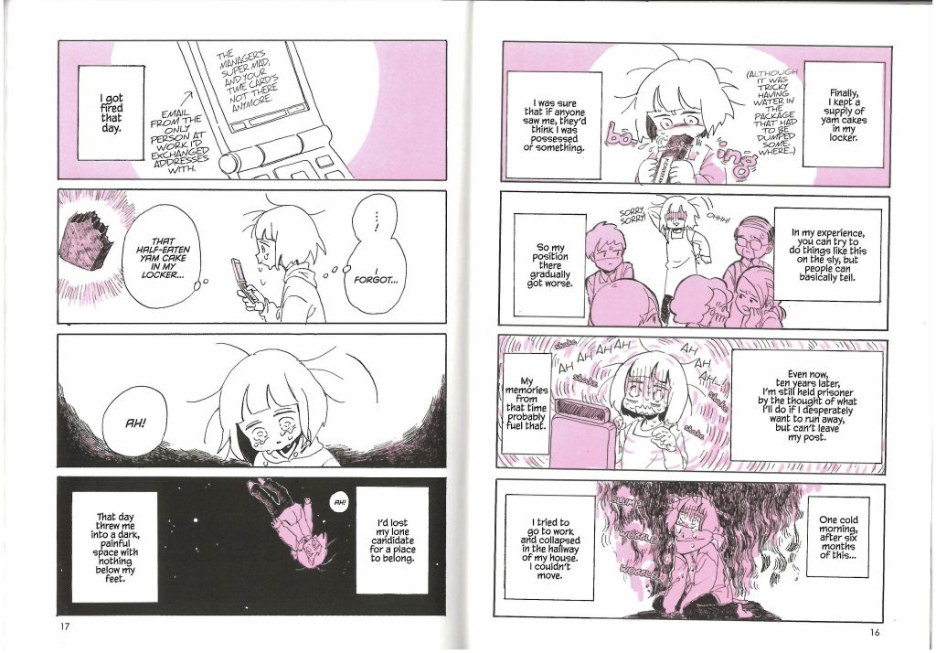 A common theme in Natata-san’s work I value is the gradual switch back and forth between depictions of reality and how she feels in her mind. The first two panels of each page in Figure 3 show what actually happened in that part of the story, and then the next two show an artistic representation of how she feels as an immediate response to those moments. She isn’t trying to tell the viewer that she actually started expelling dark essence or was floating in a ‘dark, painful space’ – she trusts our ability to understand that these are depictions of how those scenarios feel.