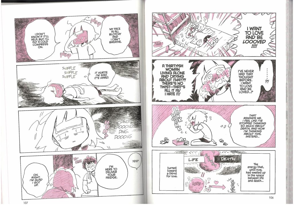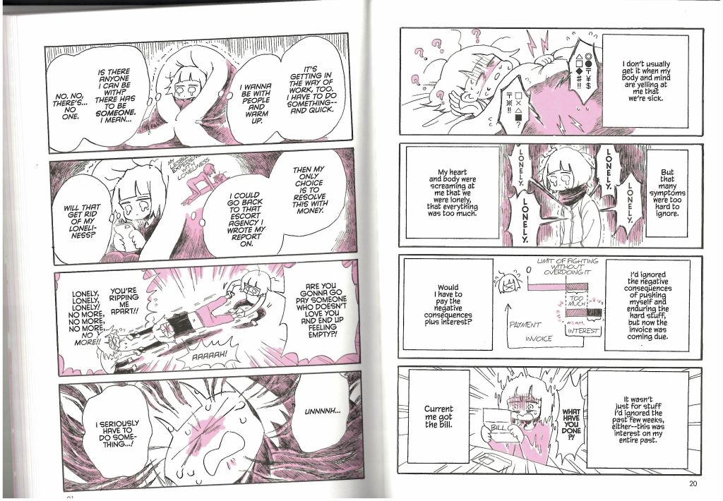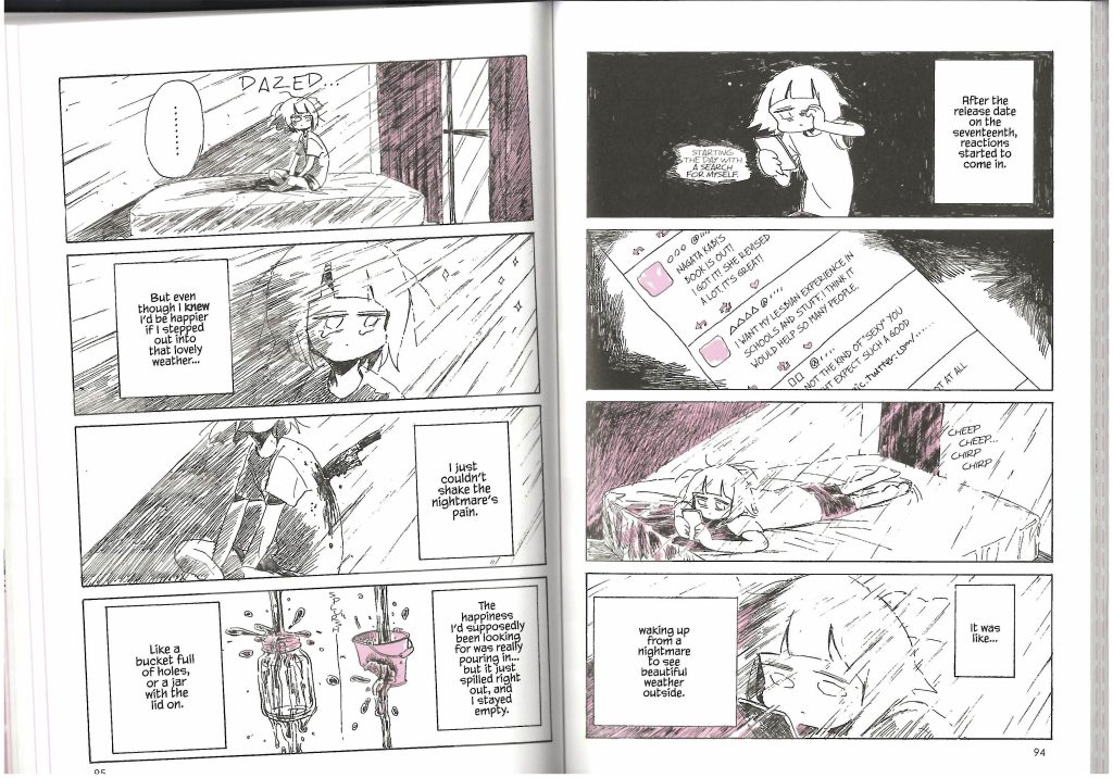 Not too long ago I discovered ‘My Lesbian Experience with Loneliness’, an autobiographical manga (Japanese graphic novel) by Japanese author and illustrator Nagata Kabi. It is about the author’s struggles with a variety of aspects of her life like loneliness, finding love from her family, desperately wanting a romantic and sexual partner, poor mental health and self-harm, as well as the causes, responses and feelings of these issues. Due to the massive success of this first publication, she has released more volumes that further document her continuing struggles and events that have occurred since, with there now being a total of 6 different releases in her series covering additional topics like alcoholism, hospitalization and marriage. I decided to purchase the first 4 series entries from a bookstore out of personal intrigue and potential relevance to my final major project.