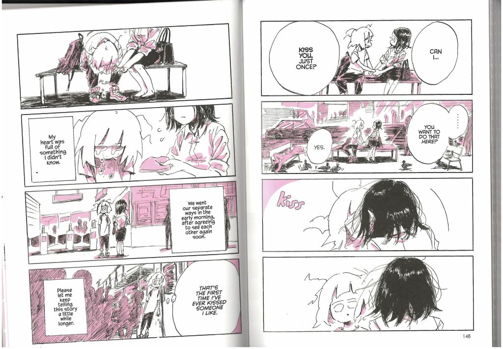 Throughout her book series, Nagata-san uses two different formats of text – speech and thought bubbles are used to show what she had thought and spoken at the time in a literal sense, whilst boxes provide narration over what is being depicted and her reflections on the matters in the present tense. I plan on only using speech and thought bubbles as I haven’t had any time to reflect on my life and issues, and I would like to focus more on the ambient space in the panels.